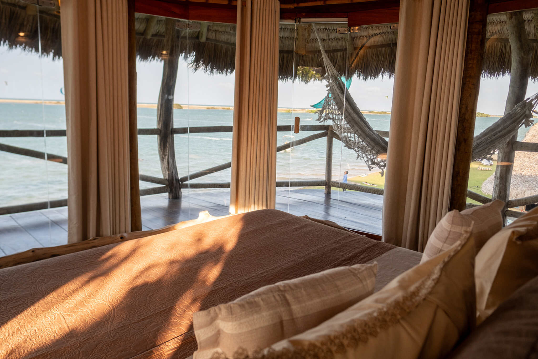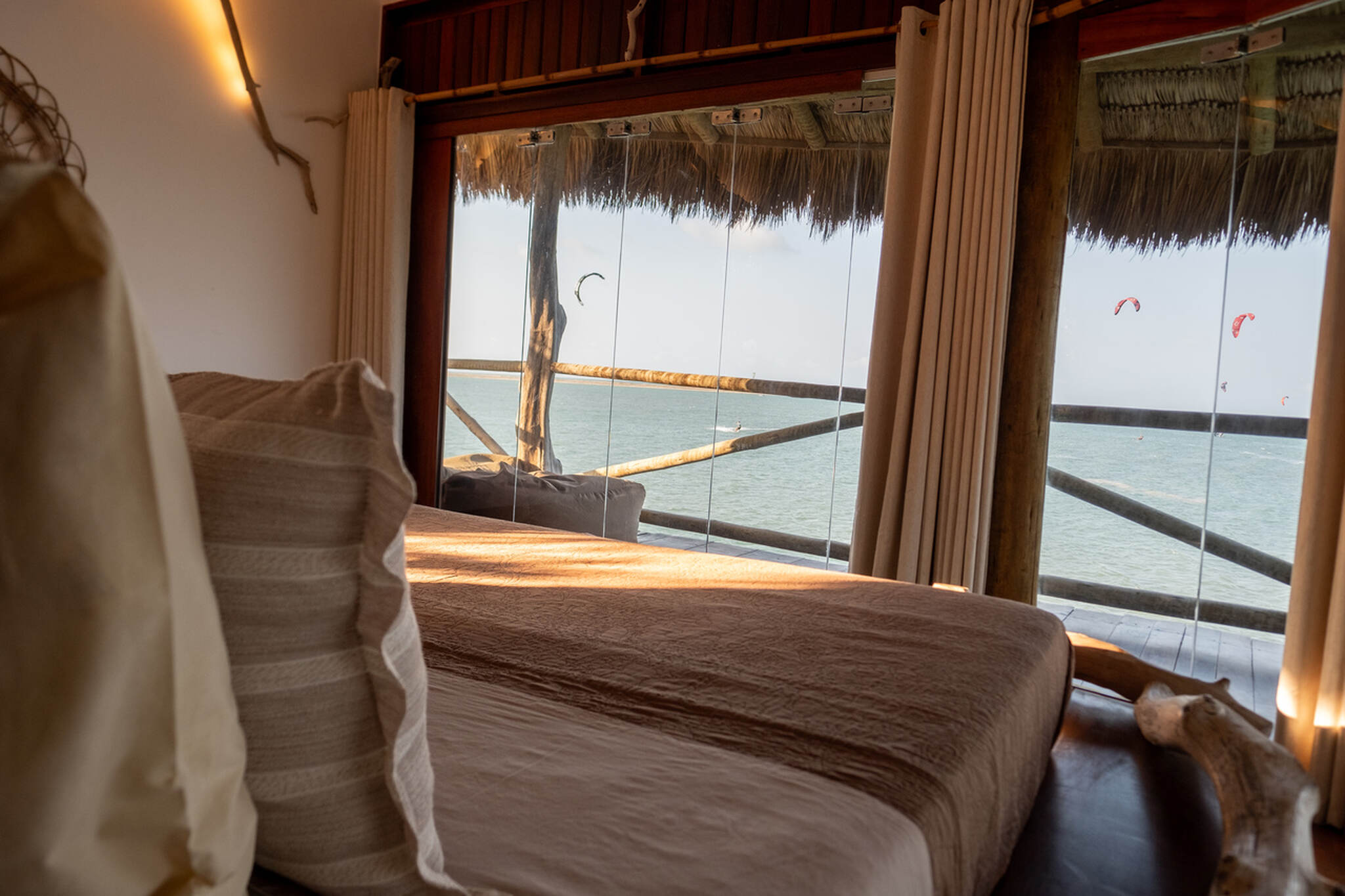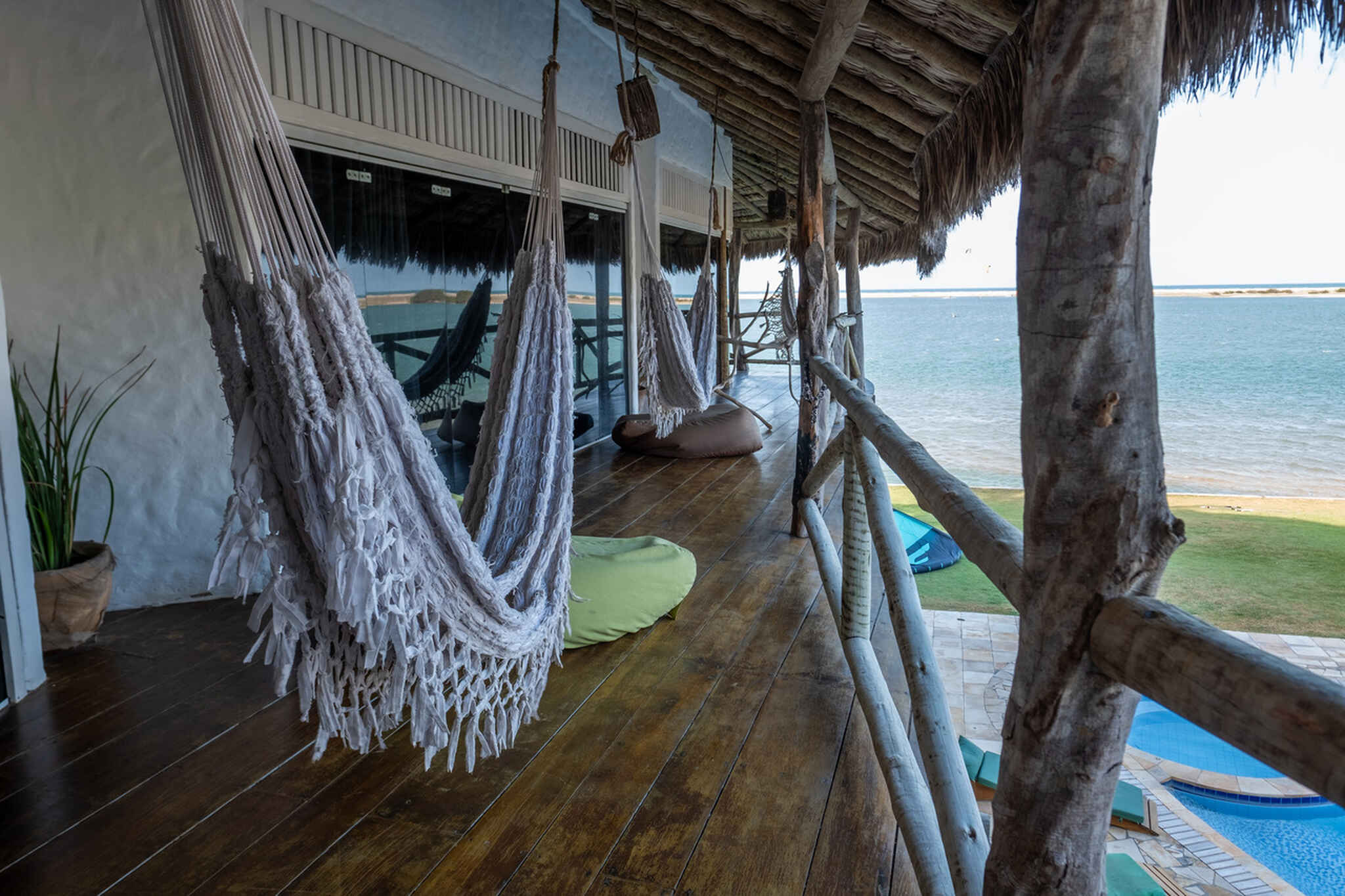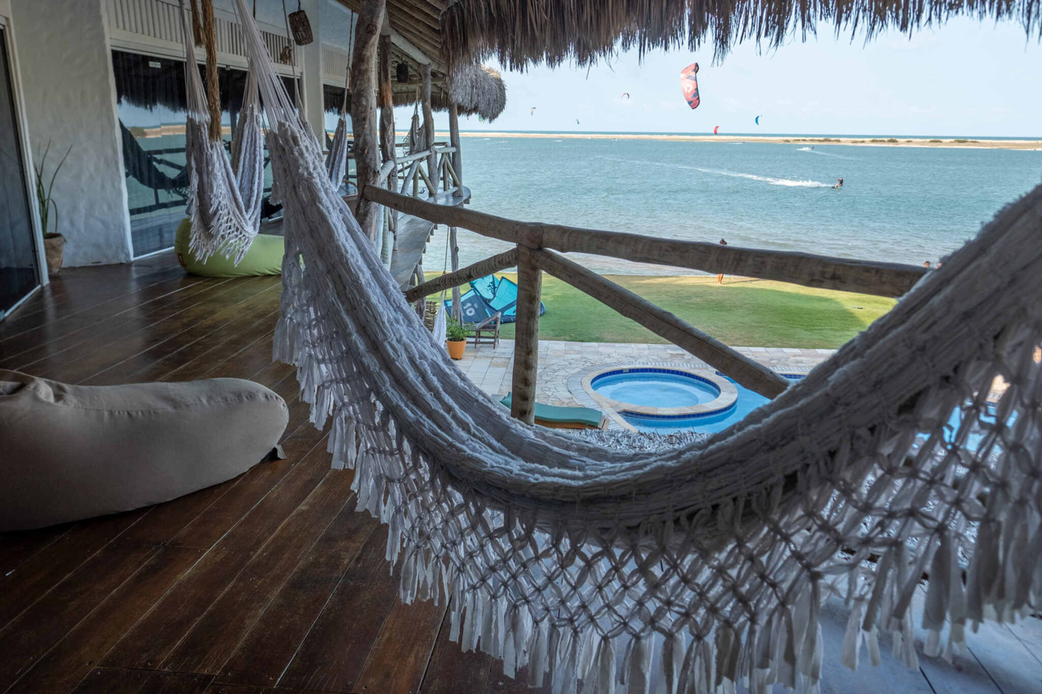 The separate kite storage and daily transfers to the low-tide kite spot are already included in the price. Our pousada also features a swimming pool, cozy hammocks, a co-working space with lagoon views, a pool table, foosball table, and a large restaurant and bar area. We also have a projector for live sports broadcasts. Free WiFi is available throughout the entire property. We look forward to welcoming you to Ilha do Guajiru. By the way: We source 100% of our electricity from our own solar energy system.